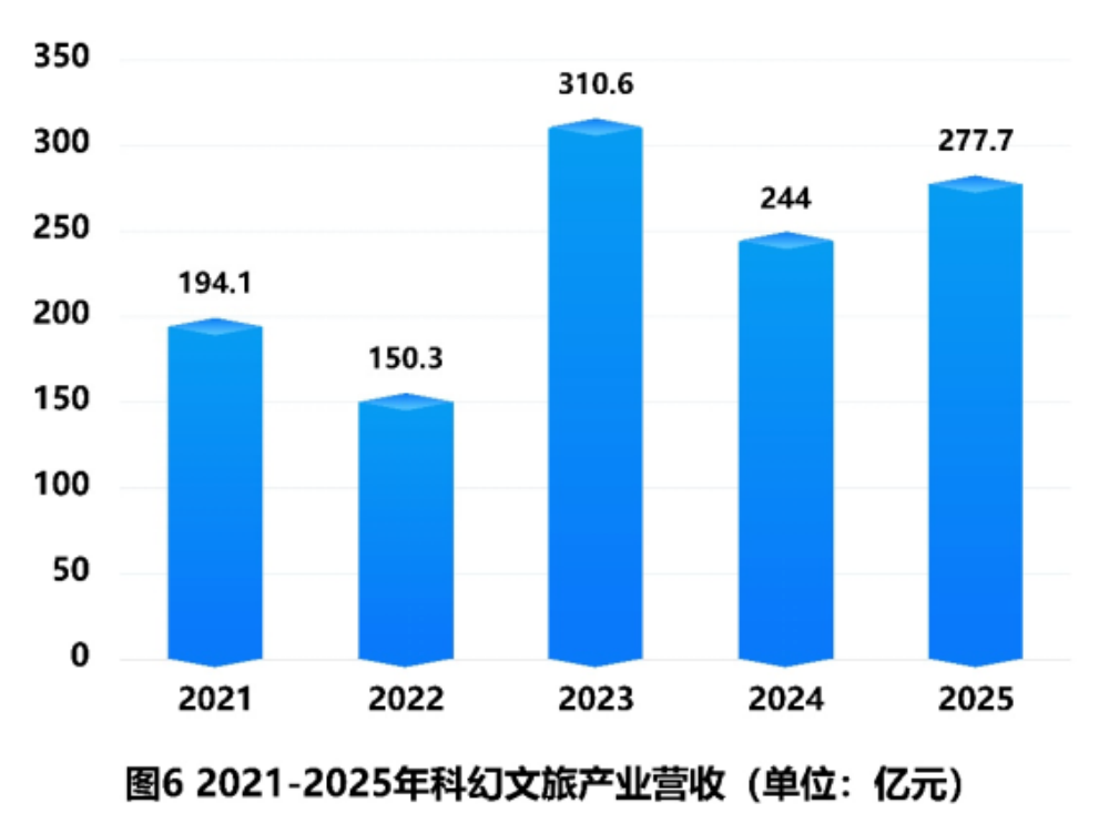 科幻文旅产业全年总营收277.7亿元,同比增长13.8%。主题公园贡献核心收入,本土原创游乐项目持续增加。VR大空间、沉浸式展览和剧本娱乐等新场景不断拓展体验边界。今年新增了两个观察维度。科幻技术装备,全年总营收达247.4亿元,以数字内容生产技术为主体、AI为引领、沉浸体验为特色的跨界应用格局形成。中国科幻全年搜索热度同比激增203.3%,现象级IP的海外受众规模持续扩大。作为我国科技创新中心和文化中心,北京科幻产业营收增速连续多年超20%,石景山区排头兵作用凸显。总体来看,中国科幻产业已形成阅读、影视、游戏、衍生品与文旅协同发展的多维格局,并在技术装备与国际传播等新领域持续拓展增长空间。随着原创IP能力提升、数字技术深度赋能与消费场景不断创新,中国科幻产业正加速迈向结构优化、动能升级的高质量发展新阶段,展现出面向全球的文化科技融合新优势。