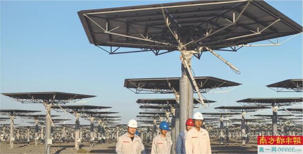 一进入这片“光海”,南都记者瞬间就被眼前震撼的景象所吸引:220米高的熔盐吸热塔耸入云霄,14500面定日镜以同心圆形式绕塔列阵,在阳光下熠熠生辉,宛如一朵绽放的巨型银色向日葵。塔上闪亮的“光球”,在戈壁像地标指引方向。