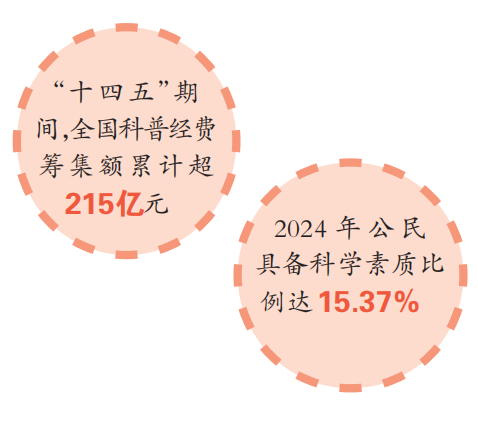 科技创新、科学普及是实现创新发展的两翼。“十四五”期间我国科普事业实现历史性跨越——全国科普经费筹集额累计超215亿元,全国科技馆和科学技术类博物馆共计1779个,公民具备科学素质比例从2020年的10.56%跃升至2024年的15.37%。一系列数据背后,是科普活动覆盖城乡、科技资源下沉基层的生动实践,是全民科学素质提升服务国家创新驱动战略的深刻体现。