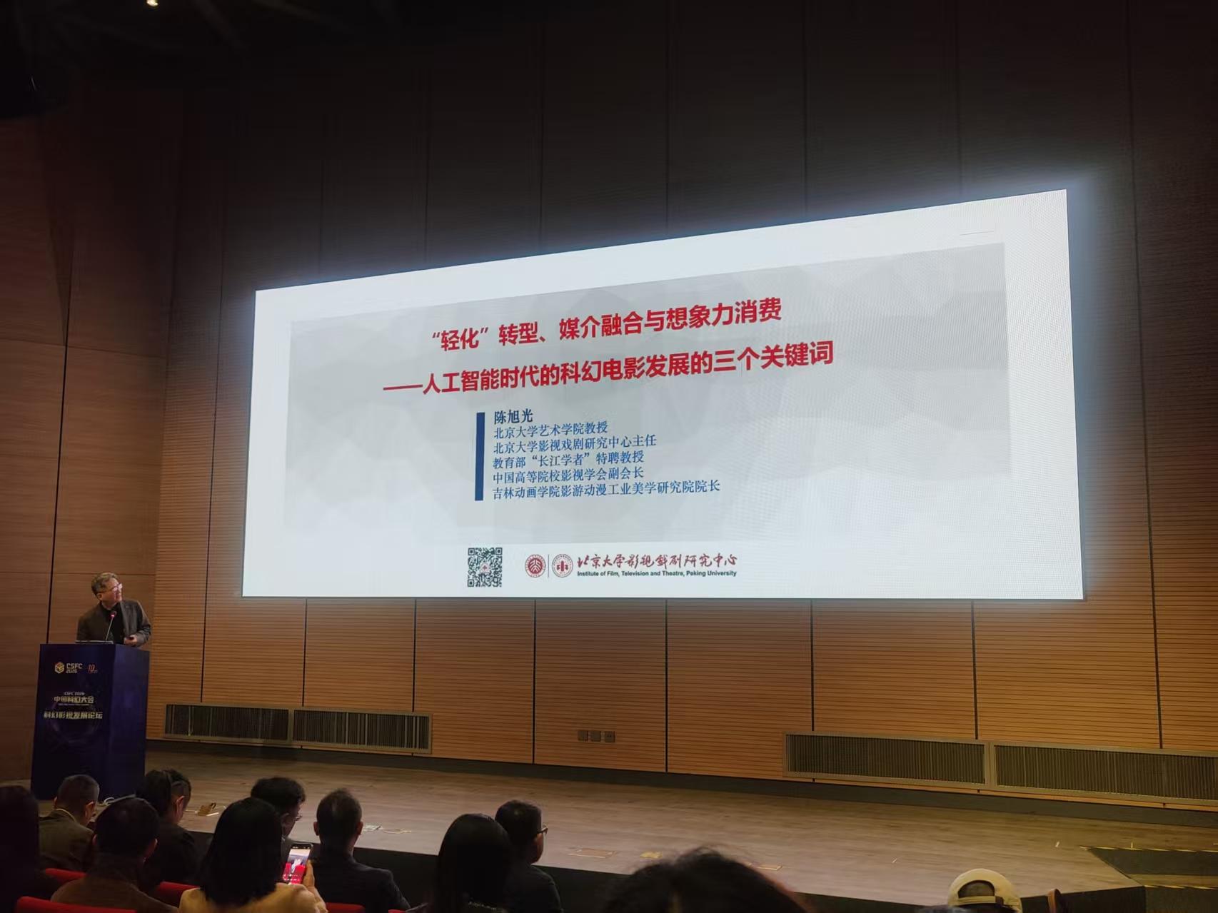 主旨报告环节,北京大学艺术学院教授、北京大学影视戏剧研究中心主任陈旭光作题为《轻化转型、跨媒融合与想象力消费——人工智能的科幻电影的三个问题》报告。他围绕“轻化”“媒介融合时代”“想象力消费”三个关键词讨论在人工智能时代中国科幻影视的发展特点。他认为,借助充沛的想象力与人工智能,立足于跨媒介的时代,中国科幻电影必定能够推动中国电影走向一个新的高峰。