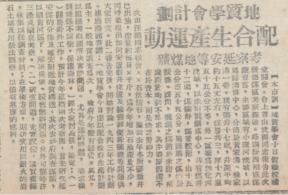《地质学会计划配合生产运动考察延安等地煤矿》,《解放日报》1943年1月12日,第2版