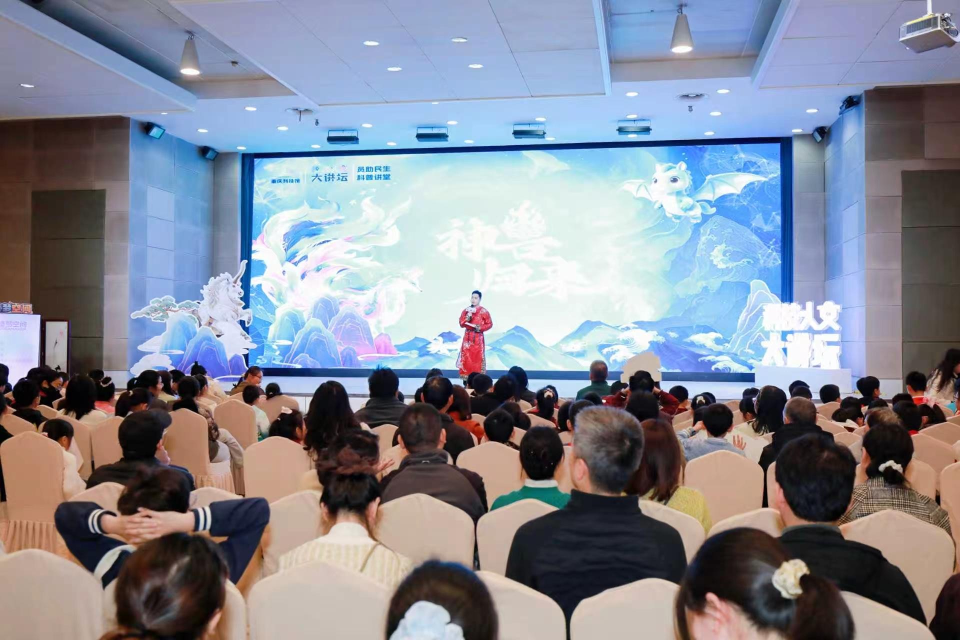 3月21日,重庆科技馆依托馆内“山海有灵——AI数字科学艺术体验展”,推出“科技·人文大讲坛”主题专场活动“神兽归来”,本次活动由市政协教科卫体委、市科协指导,吸引300余名青少年及亲子家庭参与。